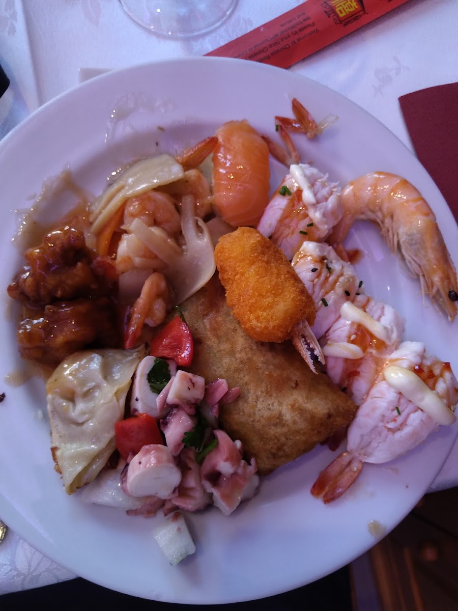 I found this Chinese sushi restaurant by accident during my visa application in Lisbon. I found it only 10 minutes of walking from my location and I went here by walking follow what Google maps told me. It is an all-you-can-eat restaurant where you can eat and come back as many times you want. Please, be wise. It is better to take less food and come back instead of having leftovers food. It is not good for the environment. The sushi somehow is too big. I almost never touched the sushi section. I am more to rhe fruits and Chinese food section. The dumplings are good. The fruits are fresh and delicious. The price is inexpensive for a buffet restaurant. The drink is not included but the price for coke is still reasonable. The restroom is free. They accept payment in cash or multibanco. The lady gives us a small accessories after the payment. It is a sweet gesture of her.